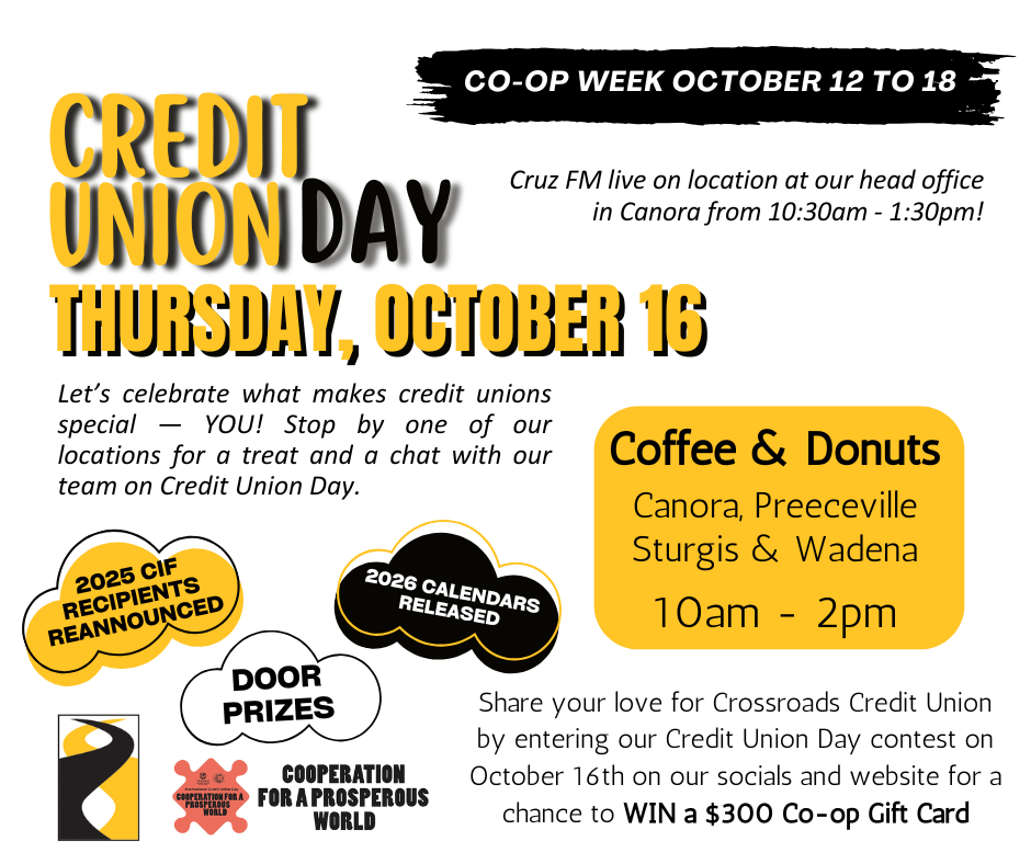 Join us on Thursday, October 16th from 10am - 2pm at any of our Crossroad's locations (Canora, Preecevillle, Sturgis or Wadena) as we celebrate Credit Union Day!